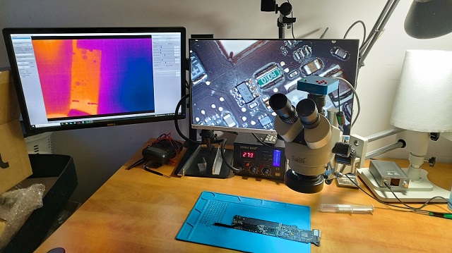 Stanowisko serwisowe wyposażone w mikroskop, kamerę termowizyjną oraz precyzyjne narzędzia do diagnostyki elektroniki. Zaawansowane metody analizy i napraw umożliwiają szybkie wykrywanie usterek oraz ich skuteczne usuwanie, co zapewnia klientom oszczędność czasu, redukcję kosztów i wydłużenie żywotności urządzeń